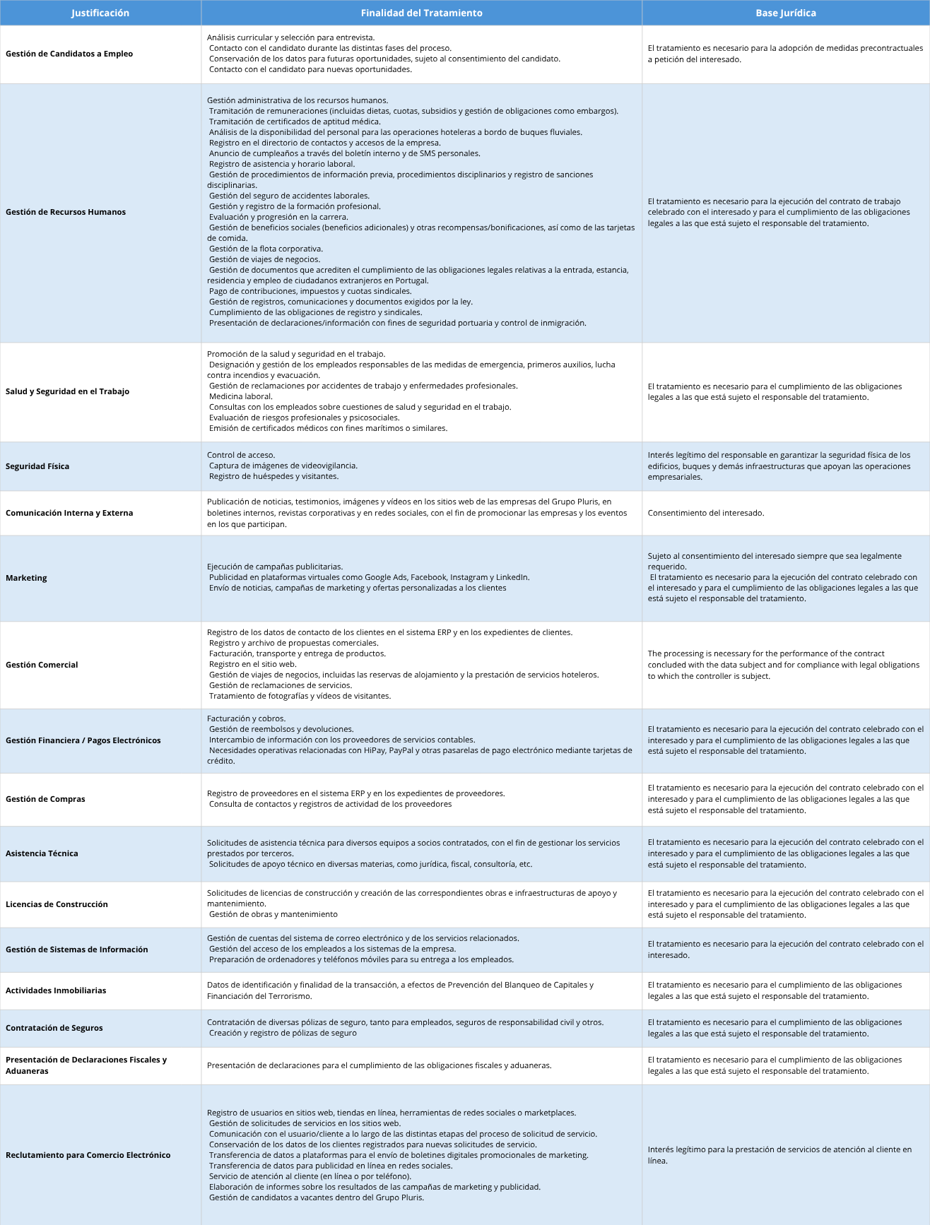 Además, para todos los efectos, el Grupo Pluris se reserva el derecho de conservar los datos personales que hayan sido objeto de tratamiento en cuestiones específicas hasta el final del plazo de prescripción aplicable a dichas cuestiones, siempre que dicho plazo sea superior a cualquiera de los indicados en la tabla anterior.