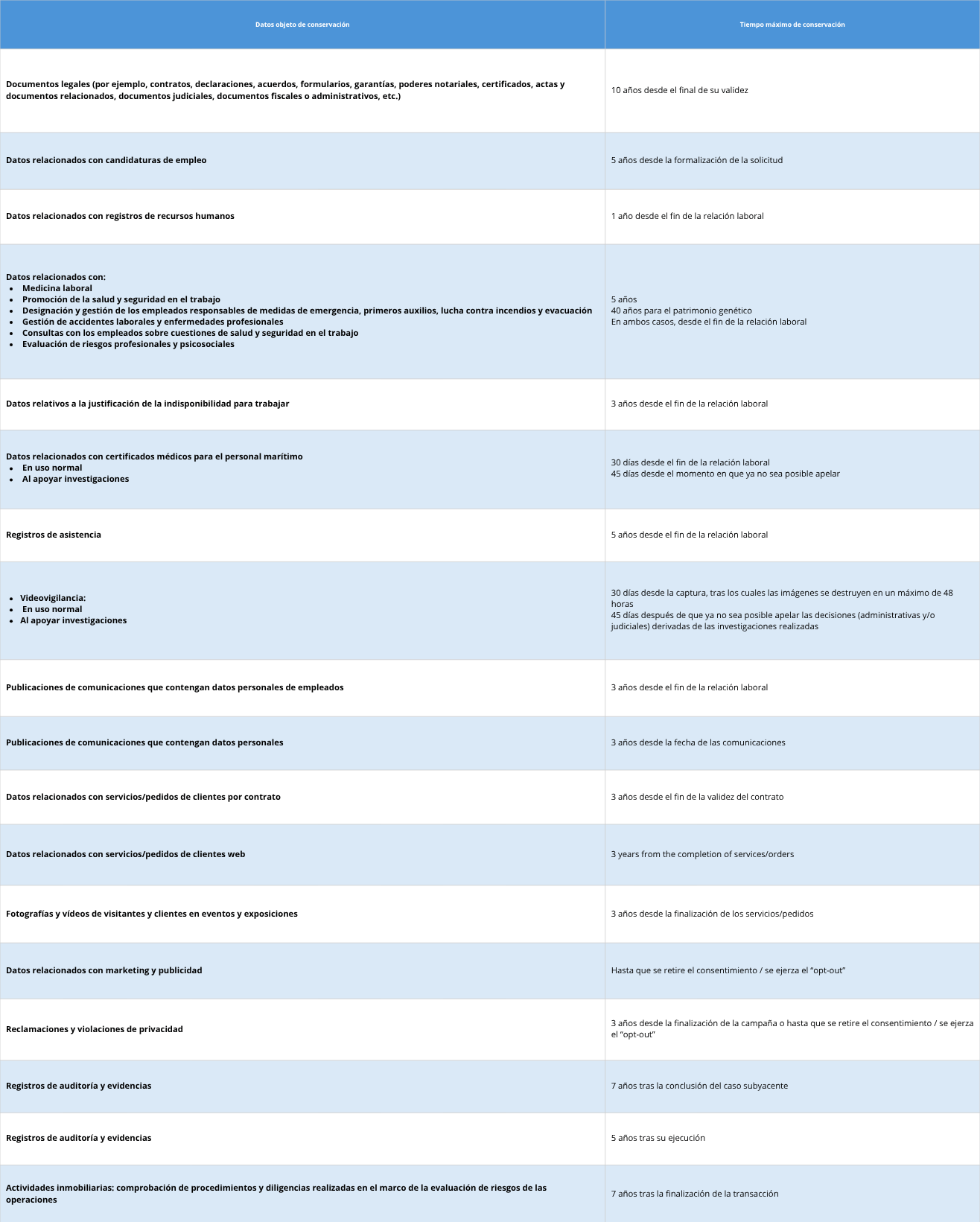 En términos generales, la tabla siguiente indica el período de conservación que el Grupo Pluris adopta en función de los datos personales en cuestión.